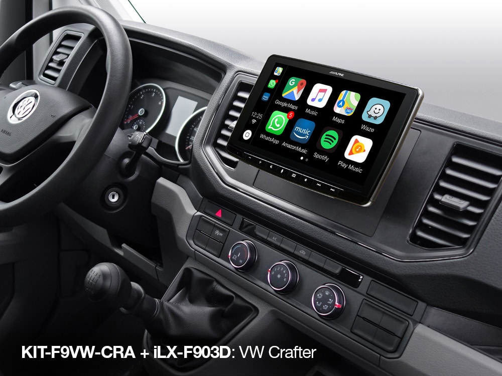 KIT-F9VW-CRA mahdollistaa Alpine iLX-F903D tai INE-F904D soittimen asentamisen uuteen Volkswagen Crafter:iin. Asennussarja sisältää kiinnitysraudat sekä muovisen peitepaneelin.