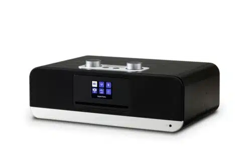 Huippuluokan pöytäradio jossa cd soitin, bluetooth ja upotettu langaton lataustelakka laitteen kannen päällä.