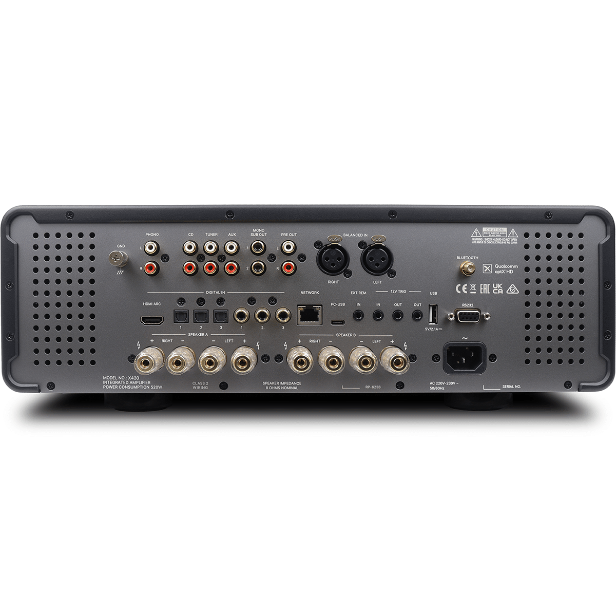 Tehon ja kontrollin idea X430:ssä on selkeä: Class AB -toteutus ja vahva kuormankesto tekevät vahvistimesta järkevän valinnan myös kaiuttimille, jotka vaativat virtaa ja hallintaa. Samalla laitteessa on moderni digitaalipuoli, Bluetooth-toisto sekä perinteiset analogitulot (myös MM-levysoitin), joten järjestelmä voi olla yhtä aikaa klassinen ja käytännöllinen. Bluetoothissa on tuki aptX HD- ja AAC-koodekeille, ja X430 on Roon Tested -sertifioitu.