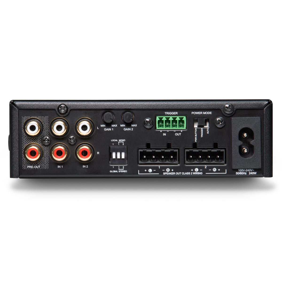 Räkkiasennettava päätevahvistin ammattimaisiin monihuonejärjestelmiin. Antaa 4×60 W tai 2×120 W tehoa luotettavasti.
