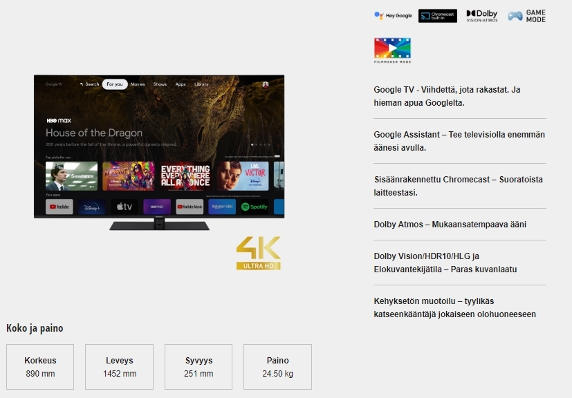 Siirry puhelimesta, tabletista tai kannettavasta tietokoneesta televisioon hetkessä. Chromecast built-in ™ -sovelluksella voit suoratoistaa kaikki suosikkielokuvasi, -esityksesi, -sovelluksesi, -pelisi ja paljon muuta suoraan televisioon.
