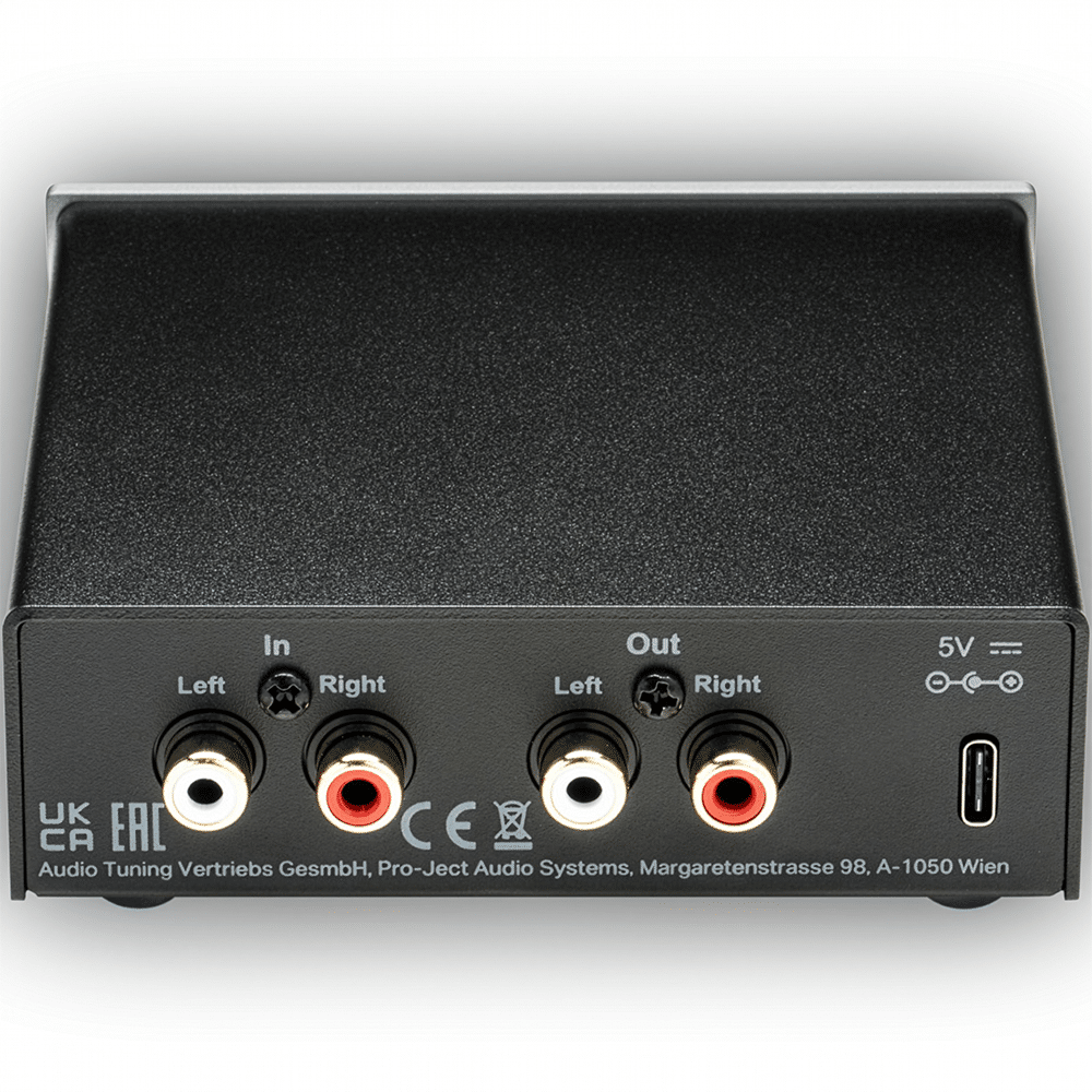 Takapaneelin RCA-tulo kertoo laitteen roolista paljon. Tämä ei ole USB-DAC eikä tietokoneelle tarkoitettu digitaalinen kuulokelaite, vaan analogiseen signaaliin perustuva kuulokevahvistin. Virtapuoli tuodaan USB-C-liitännästä 5 voltin tasavirralla, mutta USB-C toimii tässä nimenomaan virransyöttönä, ei audioliitäntänä. Head Box E toimiikin parhaiten silloin, kun lähteestä saadaan ulos linjatasoinen analoginen signaali.