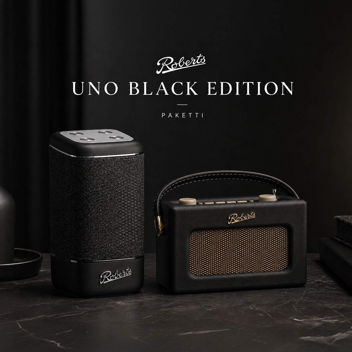 kuvan_alt: ”Roberts Uno Black Edition -paketti, musta Revival Uno BT -radio ja Roberts Beacon 325 Bluetooth-kaiutin tummassa premium-sommitelmassa.”