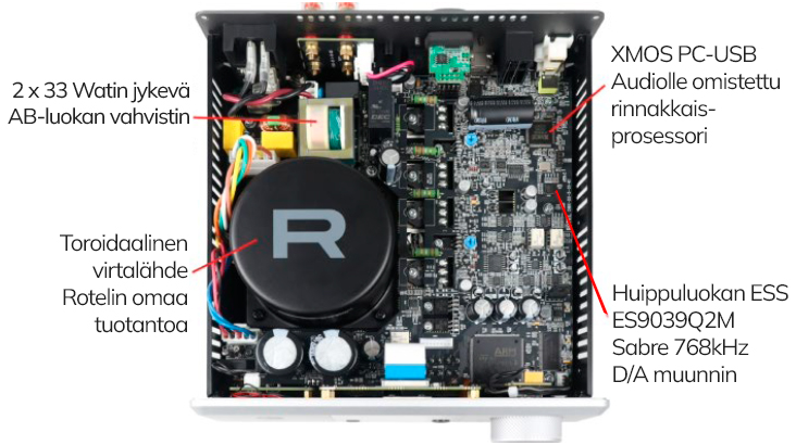 🔊 Huippuluokan rakenne – Rotelin oma toroidimuuntaja, ESS Sabre -DAC ja erilliskomponentteihin perustuva toteutus takaavat suorituskyvyn, joka soi selkeästi, dynamiisesti ja yksityiskohtaisesti – kaikki tämä tyylikkäässä alumiinikotelossa.