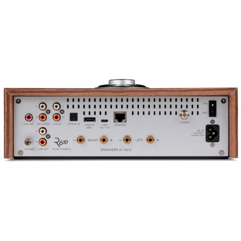 R610 on saatavilla viimeistellyissä puupinnoissa, jotka korostavat laitteen laadukasta olemusta. Muotoilu on hillitty mutta tunnistettava, ja se istuu luontevasti moderniin sisustukseen.