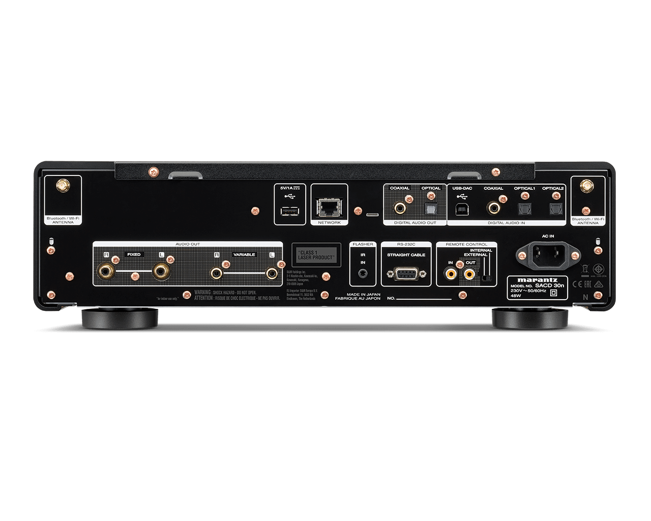 SACD 30n on tulevaisuusvarma, ja se hyväksyy tiedostomuodot aina 11,2 MHz: n quad-DSD-muistiin ja 384 kHz / 32-bittiseen PCM: ään USB-B / USD-DAC: n kautta.