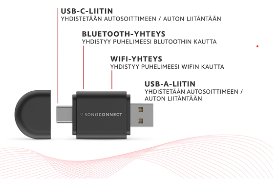 Tee autosi infotainmentista aidosti johdoton – SonoConnect SC‑MIWCA muuntaa olemassa olevan, USB‑kaapelilla toimivan Apple CarPlayn ja Android Auton langattomaksi muutamassa minuutissa. Adapteri kytketään suoraan auton CarPlay/Android Auto ‑USB‑porttiin (tuettu sekä USB‑A että USB‑C), minkä jälkeen puhelin paritetaan Bluetoothin kautta; yhteys siirtyy tämän jälkeen automaattisesti Wi‑Fiin, joka hoitaa varsinaisen datasiirron sujuvaa käyttöä varten. Tämä on adapterin normaali toimintatapa: Bluetoothilla tehdään paritus, Wi‑Fi ylläpitää yhteyden.