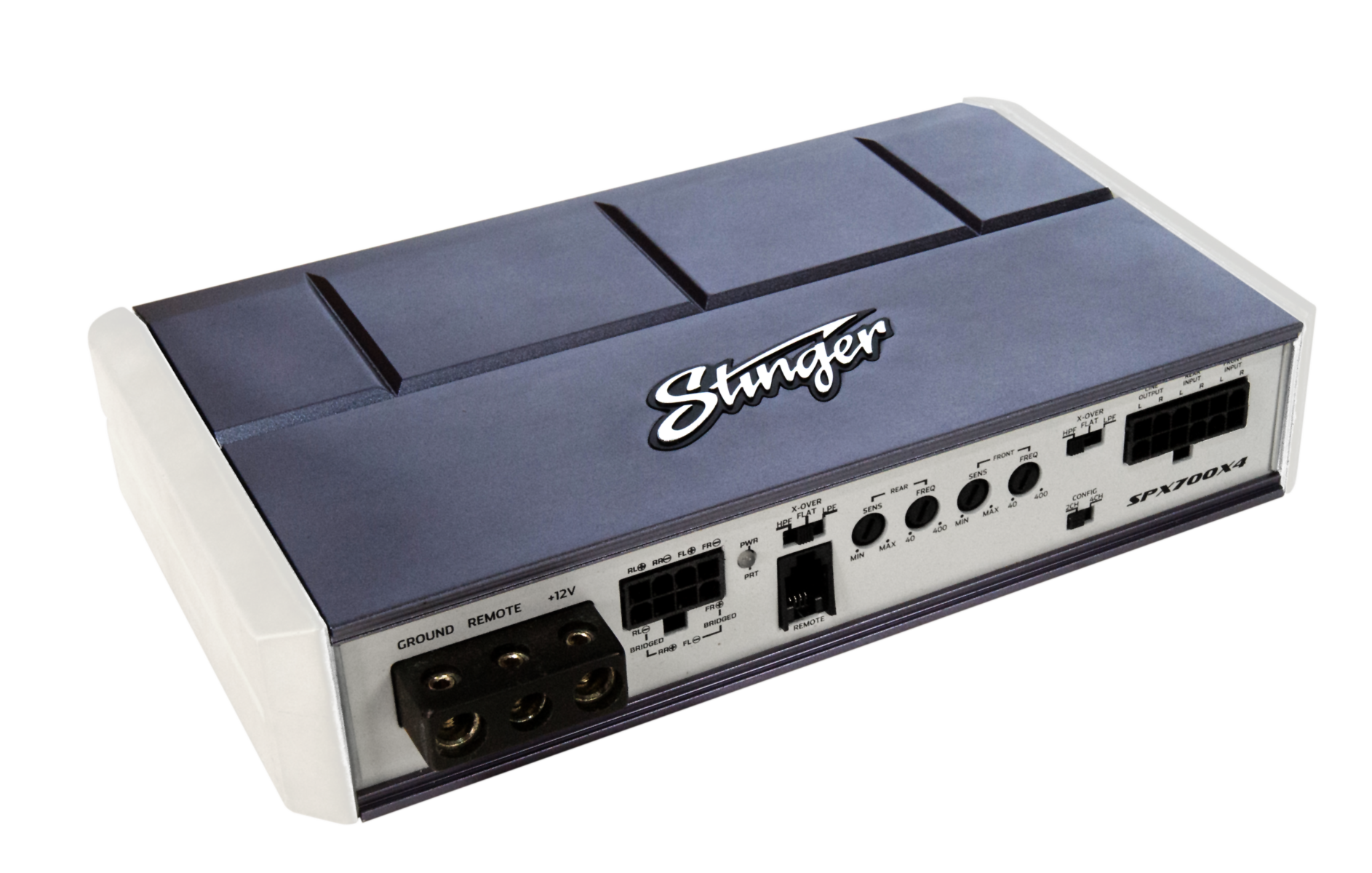 Stingerin kompaktin kokoinen vahvistin IPX4/5 suojauksella mahdollistaa vahvistimen toiminnan 2/3/4-kanavaisena.