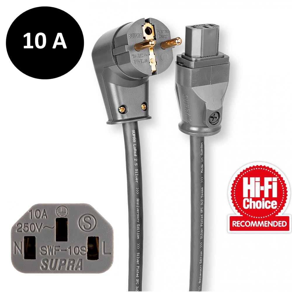Osana Supran 40-vuotisjuhlapäivää julkaistu LoRad SPC (Low Radiation, Silver Plated Copper) verkkovirtakaapeli sisältää hopeoidut 2.5mm2 kupariset sisäkaapelit ja Supra SWS10S naarasliittimen sekä Supra SW-EU/A kulma urosliittimen.