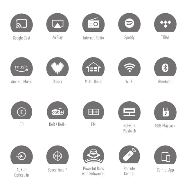 • WiFi-suoratoisto ja monihuoneohjaus: Spotify, Tidal, Google Cast ja AirPlay 2