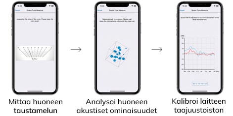 Lisäksi iOS-laitteille on saatavilla kalibrointisovellus, joka analysoi huoneen akustiikan iOS laitteen mikrofonilla ja säätää DSP-parametreja optimaalisen äänen saavuttamiseksi.