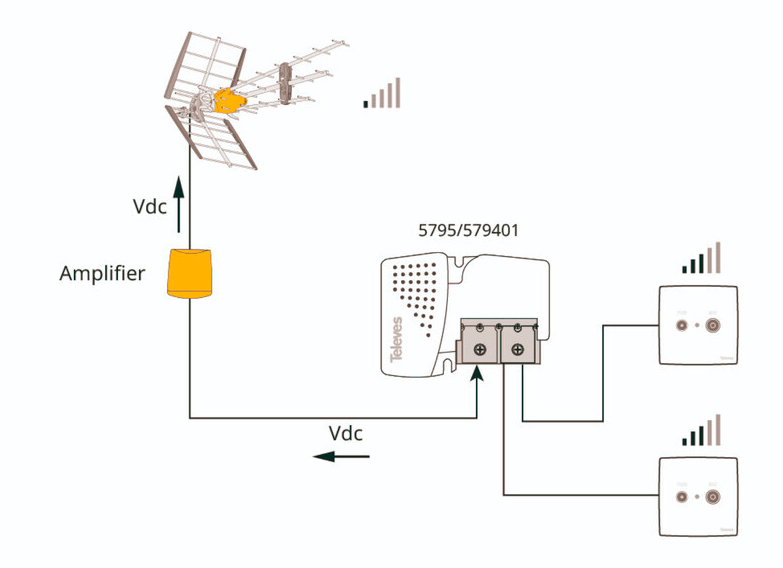 • Täyteen vahvistustehoon saatavilla erikseen Televes Picokom (24V, 130 mA) virtalähde
