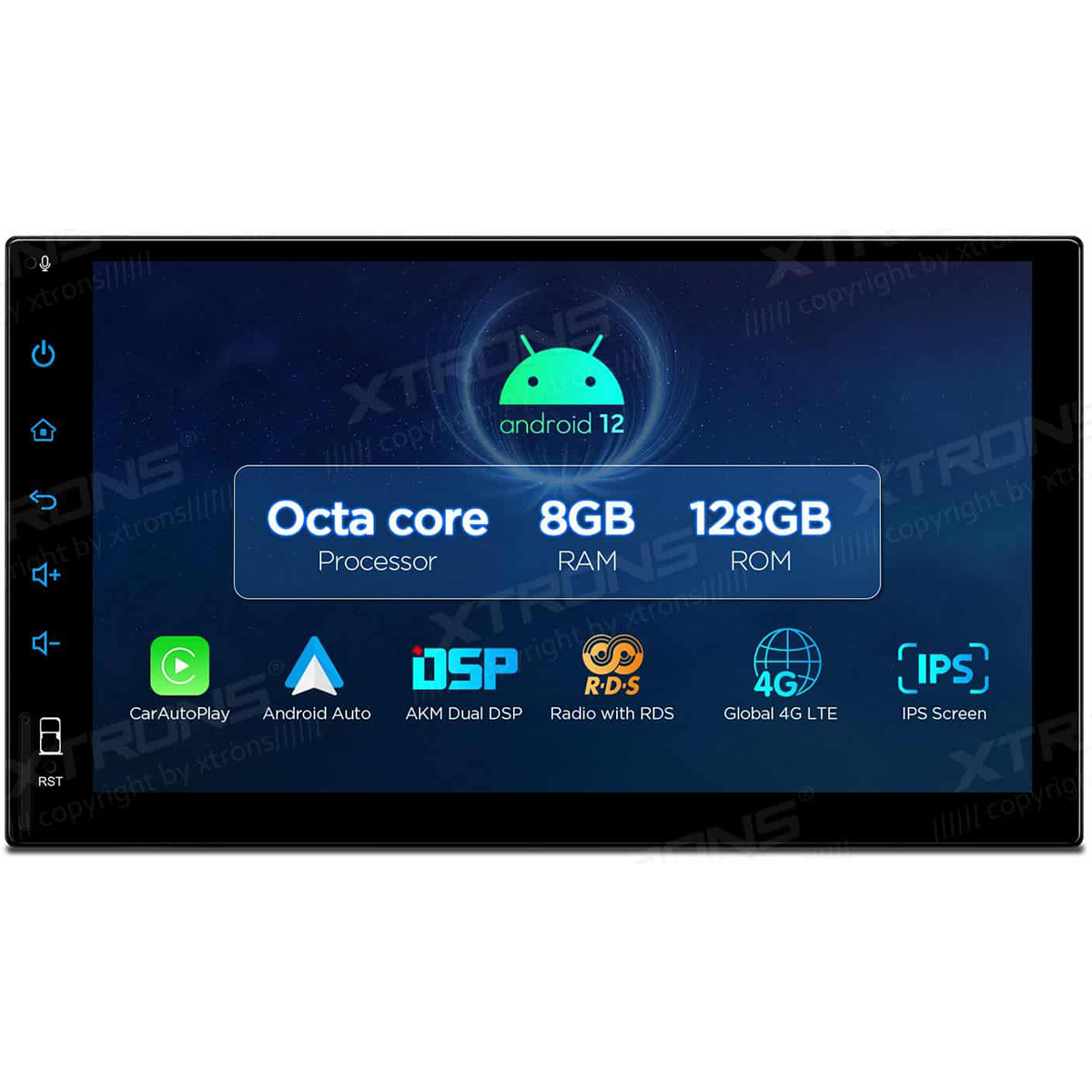 brand: Xtrons model: TIX725LS category: 2-DIN Android car stereo display: 7" IPS 1024×600 os: Android 12 processor: Octa-core (A75 + A55) ram_gb: 8 storage_gb: 128 dsp: ROHM integrated DSP carplay: yes (wireless & wired) android_auto: yes (wireless & wired) wifi: dual band 2.4G / 5G bluetooth: 5.0 camera_support: AHD/RCA input gps: built-in amplifier_ic: TDA7388 radio_ic: TDA7708 with RDS body_material: aluminum heat sink connectivity_ports: - 2× USB - 1× SD - RCA I/O - 4G LTE SIM slot mount_type: universal 2-DIN